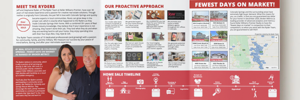 This custom tri-fold brochure was created to be used as a key sales tool for The Ryder Team at Keller Williams Premier. The piece was used during listing presentations to showcase the team’s experience, process, and results to potential home sellers.